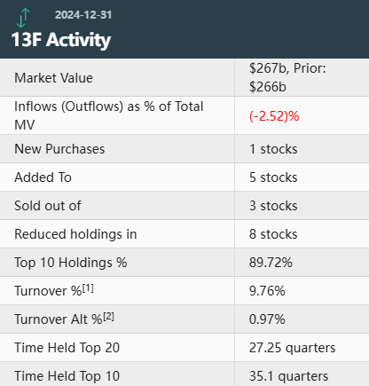 在前十大持仓股中,伯克希尔在四季度还减持了医疗保健服务公司德维特——相关持股减少了约20.3万股,环比减少0.56%。