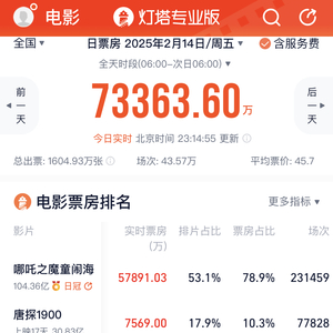 与往年情人节档期爱情片唱主角不同,今年情人节档基本延续春节档的格局,《哪吒之魔童闹海》和《唐探1900》两部冠亚军电影继续保持领先。《哪吒2》排片占比53.1%,票房占比78.9%,继续保持碾压级的遥遥领先。