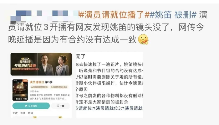 节目上线时间临时延后,姚笛的镜头又无影无踪,让“姚笛 被删”迅速登上热搜榜第一,更引发“劣迹艺人”的猜测。14日晚,据极目新闻报道,姚笛临时被删除是“合同问题”。