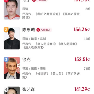 值得一提的是,在该榜单当中,大多数导演都是凭借两位数的作品登上榜单,只有饺子一位导演只凭借“哪吒”系列的两部作品就能登顶。