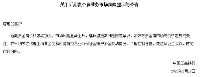 2月12日,工商银行、建设银行同时发布关于近期贵金属市场业务风险提示的公告。两大银行在公告中指出,近期贵金属价格波动加剧,市场风险显著上升,提醒投资者一定要提高风险防范意识,加强对贵金属市场与价格走势的关注,合理控制仓位,防范市场风险,理性投资。