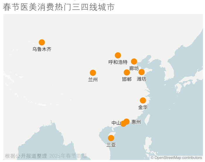 从区域分布来看,春节周期医美消费增速最高的三四线地区,分别为邯郸、潍坊、兰州、呼和浩特、三亚、金华、中山、廊坊、乌鲁木齐和惠州。