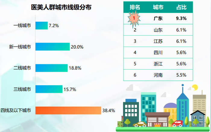 根据《2023医美人群洞察报告》,四线及以下城市新尝试医美的人群占比38.4%,其次是才新一线城市,占比20.0%。