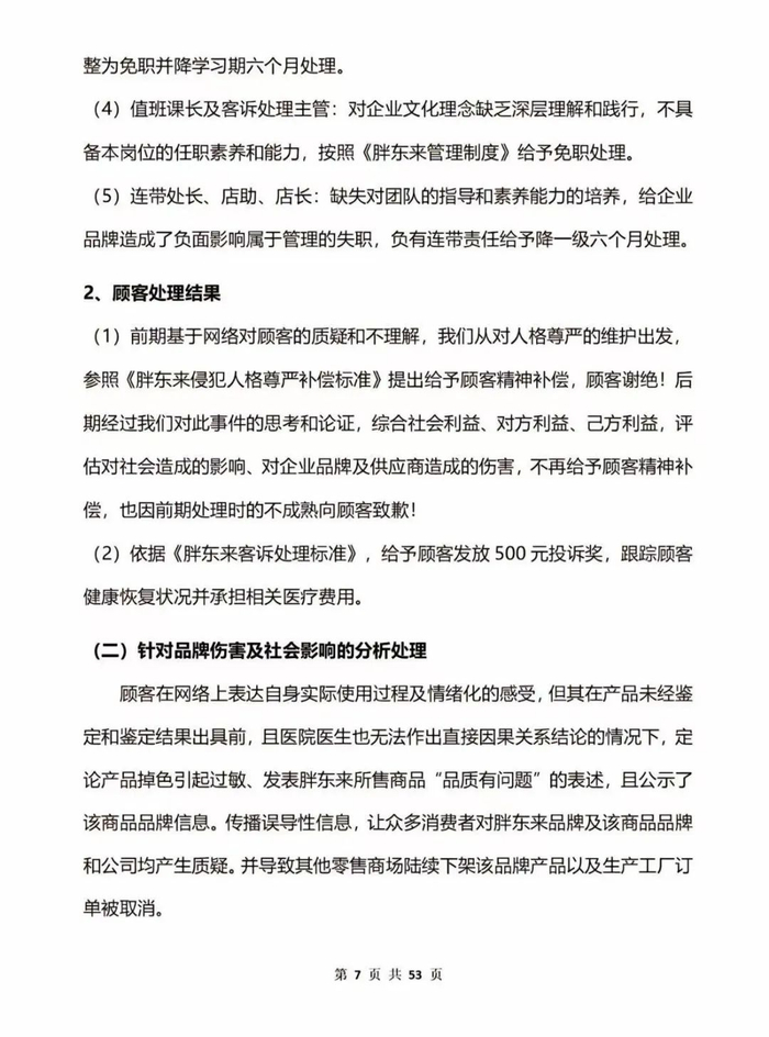 由于对企业文化理念的认知不够,未按照流程标准为顾客处理与解决,给顾客造成伤害且造成社会负面舆论影响,胖东来对实习班长予以免职并降学习期六个月处理,对值班课长以及客诉处理主管也予以免职处理,连带处长、店助、店长负有连带责任给予降一级六个月处理。