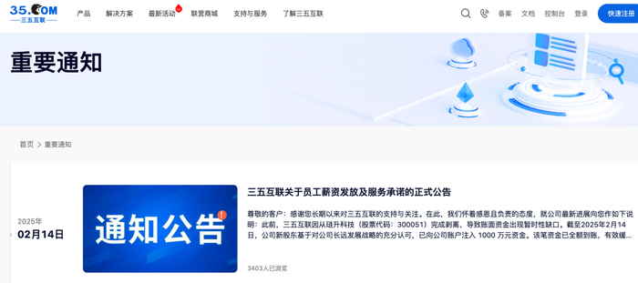 2月14日,三五互联在官网刊登《三五互联关于员工薪资发放及服务承诺的正式公告》:“此前,三五互联因从琏升科技(股票代码:300051)完成剥离,导致账面资金出现暂时性缺口。截至2025年2月14日,公司新股东基于对公司长远发展战略的充分认可,已向公司账户注入1000万元资金。该笔资金已全额到账,有效缓解公司此前因股权变更因素导致的资金紧张局面,公司所有员工工资均可在本日内发放完毕。”