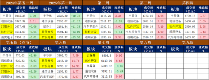 2025年,不论是全球博弈,还是全球产业升级,科技因素被提到了更高的权重。截至2月14日收盘,今年成交额前五的行业,已经提前被科技产业占据。根据Wind数据,如果细分到行业周成交额的话,就是下图给大家呈现的情况。关注微信公众号“道达号”,获取更多股市资讯。