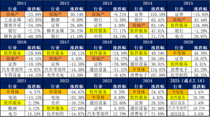 年初这段日子,适合定全年方向。小二统计了Wind数据中从2011年至今的年度成交额前五申万二级行业,资金博弈越多的方向,自然就是行情主线。