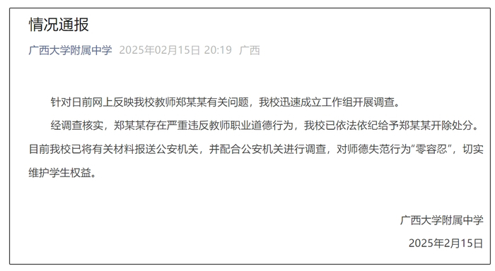 微信公众号“广西大学附属中学”2月15日发布情况通报: