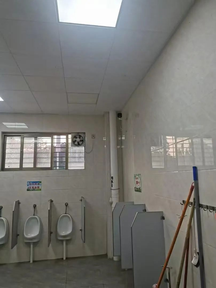 近日,有网友发视频称,广州市番禺区石楼中学在厕所里安装监控。视频显示,一男厕墙壁上方悬挂一摄像头,角度略微向下对着门口的洗手槽,而一排小便池则位于摄像头与洗手槽之间。