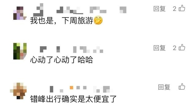 综合机酒均价和人流量维度,错峰游推荐目的地有南京、天津、洛阳、厦门、福州,春节节后一周酒店均价环比假期期间平均下降四成。从机票价格维度,降幅明显的目的地有重庆、昆明、哈尔滨、三亚、海口,均价下降三、四成。不少网友直呼:“心动”!