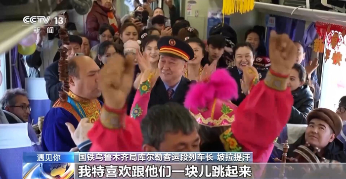 国铁乌鲁木齐局库尔勒客运段列车长 坡拉提汗:他们卖完以后,我特喜欢跟他们一块儿跳起来。有时候,人特开心的时候,表达不出来,我最大的表达方式,还是新疆人的方式,跟他们一起跳起来。