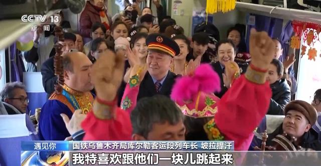 国铁乌鲁木齐局库尔勒客运段列车长 坡拉提汗:他们卖完以后,我特喜欢跟他们一块儿跳起来。有时候,人特开心的时候,表达不出来,我最大的表达方式,还是新疆人的方式,跟他们一起跳起来。