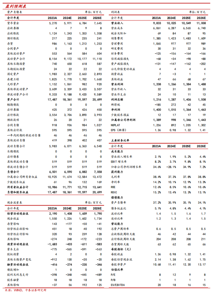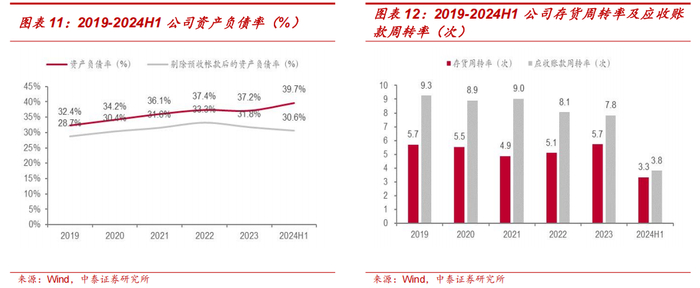 资本结构健康,营运能力良好。资本结构方面,公司 2022 年资产负债率有所增长主要由于应付账款中待结算货款增加,2023 年增长主要因合同负债增加,而剔除预收账款后的资产负债率仍保持较低水平,资本结构健康。营运能力方面,公司实施了应收账款、存货专项检查,进一步优化完善内部控制,建立健全了风险防控长效机制,企业发展的安全屏障更加牢固,存货周转率与应收账款周转率均保持较高水平,2022-2023 年应收账款周转率下降主要因应收账款中应收定向类客户款项增加。