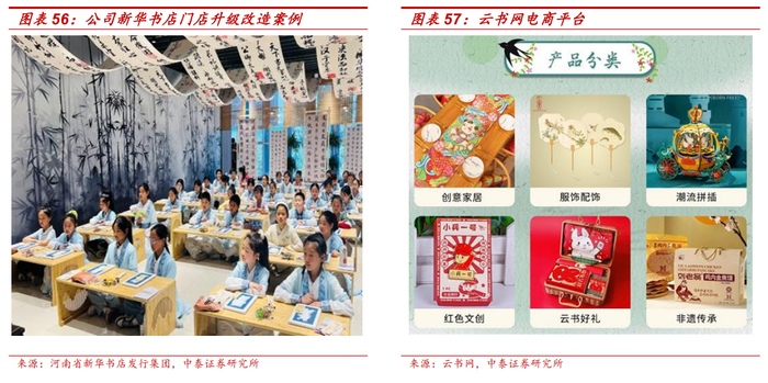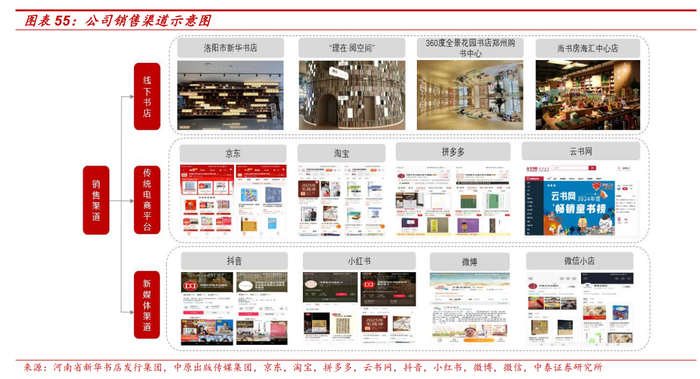 首先,公司以教材教辅、一般图书的出版发行为主要业务,旗下出版社、物资集团等子公司提供出版完整产业链服务,积累了丰富的 IP 资源(文献集成、小说等类型)。公司是主流教材出版单位的河南省独家代理商,所属出版企业获得了河南省教育行政部门对全科评议教辅出版的行政许可,资质优势明显,开发出版了系列教辅产品。同时,公司积极开拓多元化渠道,包括传统新华书店门店、云书网、新媒体渠道等,助力图书销售转化。