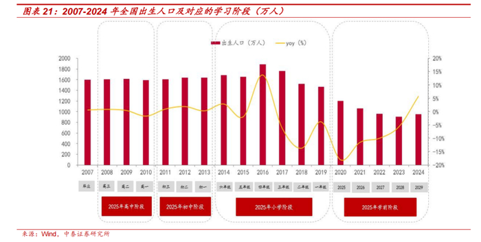 出生人口下滑对教材教辅影响中短期内无虞。地方国企出版集团核心收入产品为教材教辅。从探讨教材教辅营收成长动力角度,市场对于出生人口下滑影响教材教辅收入增长的担忧是压制出版行业估值的主要因素之一。但是,我们认为,出生人口下滑对教材教辅收入(更准确表述应为 K12 各学习阶段的教材教辅收入)增速中短期内影响有限。2025 年所对应的小学阶段出生人数规模受益于 2016-2017 年二胎开放后的出生人口高峰保持较高水平,规模达约 1.0 亿人。同时,K12 在校学生整体基数较大,单个年级学生人数减少对于整体规模影响较小。