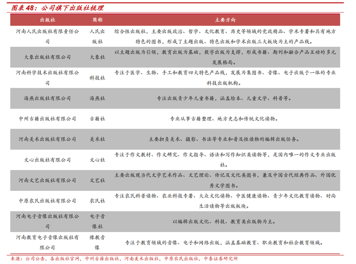 教育出版优势明显,大众出版推动专业化、品牌化发展。公司拥有 11 家出版社,涉及教育、科技、少儿、文艺等多个领域。教材教辅方面,公司凭借产品内容、质量和服务的独特优势,出品的系列产品在区域市场处于主导地位。以教育出版为基础的大象出版社 2023 年营收同增 14.2%,净利润同增36.3%。一般图书方面,公司依托地区特色,积极打造豫版图书品牌,通过优化资源配置推动出版专业化、品牌化发展。