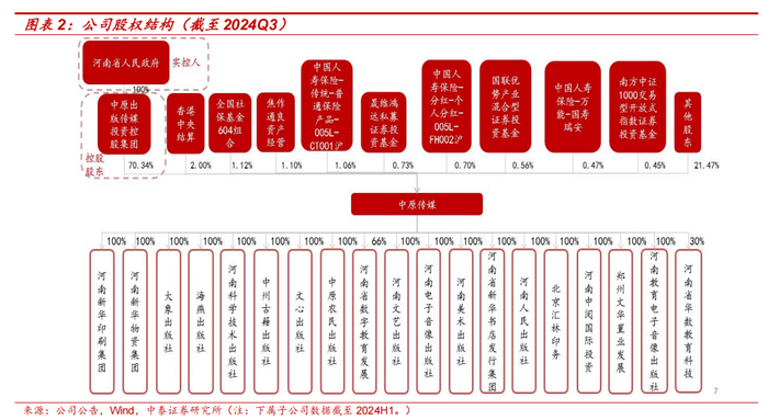 控股股东产业资源丰富,实控人为河南省人民政府。截至 2024Q3,中原出版传媒投资控股集团持有公司 70.3%的股权,为公司控股股东;河南省人民政府持有中原出版传媒投资控股集团 100%股权,为公司实控人。中原出版传媒投资控股集团是河南省最大的文化产业集团,主营业务涵盖出版、文创、印制、图书发行、文化地产等;旗下拥有河南人民出版社等 11 家出版社、《销售与市场》等 21 种报刊、130 家省市县新华书店和新华印刷集团、新华物资集团等各级(五级)子(分)公司共 195 家,产业布局遍布全省各地以及北京、深圳等地。