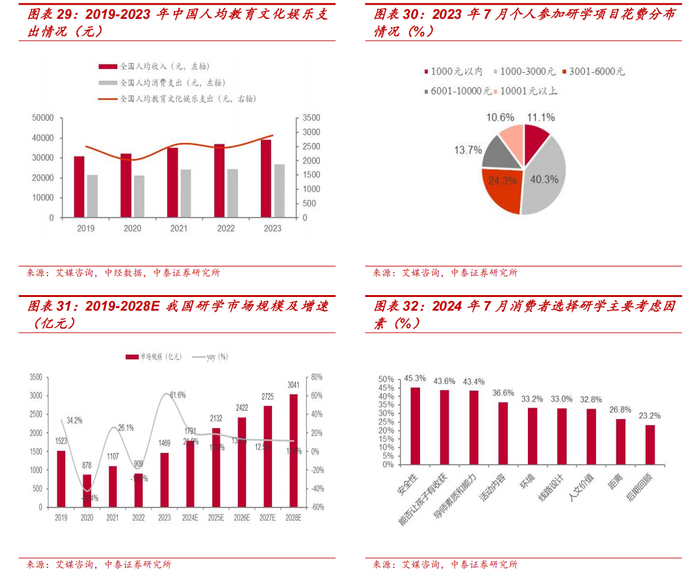 研学实践消费需求旺盛,看好出版公司脱颖而出。艾媒咨询和中经数据数据显示,2019-2023 年,我国人均教育文化娱乐支出整体呈上升趋势,2023年人均支出达 2,904 元。伴随疫后线下娱乐生态修复以及供给端研学主题和内容不断丰富,学生家长对于研学消费需求旺盛。根据艾媒咨询 2023 年 7月调研数据,40.3%消费者在研学项目花费金额保持在 1,000-3,000 元水平。