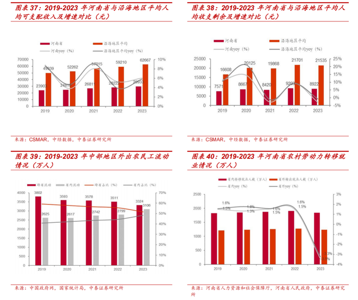 河南省省内就业吸引力增强,人口净流出现象改善可期。河南省出生人口下降除了出生率影响外,另一个主要影响因素为人口持续流出。河南省既是农业大省,也是传统劳动力输出大省,经济发展不充分不平衡导致省内人口孔雀东南飞现象成为常态,其流出人口主要流向经济发达的沿海地区,如广东、浙江等。但是,伴随河南省工资水平、公共服务水平提升以及沿海地区生存成本上升,河南省同沿海地区收支剩余增速差距整体已开始收窄。