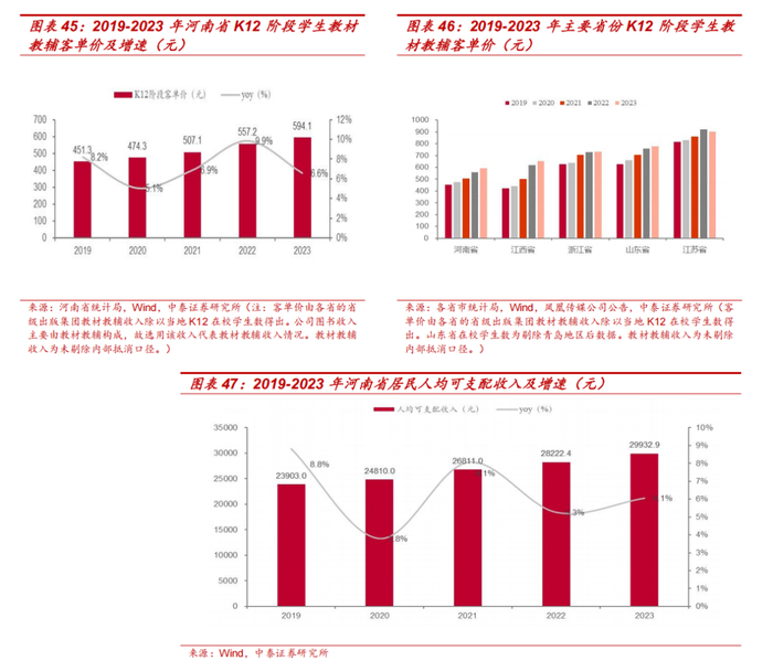 看好省内教材教辅客单价持续增长。价格维度,河南省 K12 阶段学生教材教辅客单价亦保持稳中向上趋势,2023 年达 594.1 元,4 年 CAGR 达 7.1%,与其他教育大省相比客单价基数较低,提升空间广阔。我们认为,教材教辅作为 K12 阶段学生升学过程中的主要需求品,位于小升初、中考、高考等阶段的学生存在较旺盛的备考使用需求且生均教材教辅支出较高。伴随素质教育育人所需知识覆盖范围增加、省内初高中学生数量增加及人均可支配收入上升,看好教材教辅客单价持续增长。