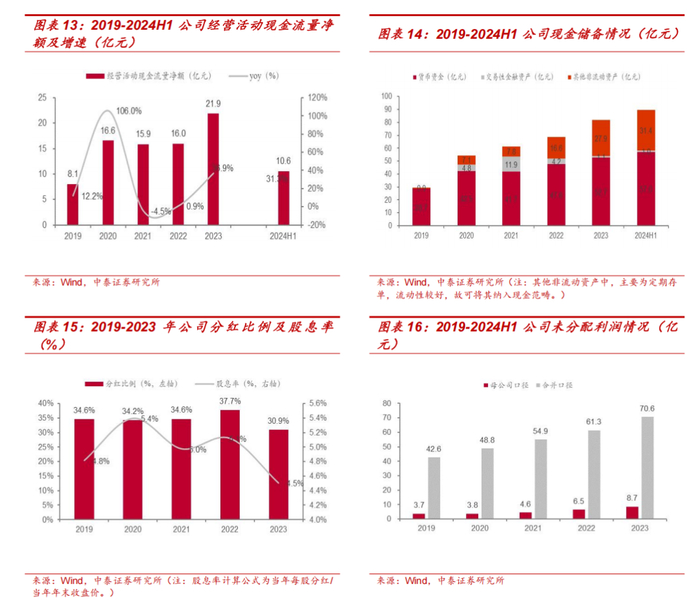 现金流充足,分红比例提升空间较大。2019-2023 年,公司经营活动现金流量和账上现金整体呈向上趋势,现金储备较充足,以有力支持未来经营活动开展及创新业务拓展。分红方面,公司近 5 年分红比例维持在 30-40%水平,股息率维持在 4.5%及以上水平,考虑到公司未分配利润充沛(母公司以及合并口径体量均较为可观),现金流状况优异,后续分红比例仍有较大的提升空间。