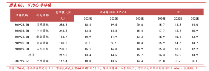 我们预计中原传媒2024-2026年收入分别为100.25/105.49/110.08亿元,分别同增1.95%/5.22%/4.35%。考虑到所得税政策变化会对公司2024-2026年归母净利润产生影响(其中,2024年归母净利润涉及冲回2023年度确认的相关递延所得税资产,所得税免征对于2025-2026年归母净利润构成正向影响),我们预计2024-2026年归母净利润分别为9.98/13.46/14.43亿元,分别同比增长-28.14%/+34.90%/+7.22%,对应PE估值分别为11.8x/8.7x/8.1x。我们选择出版行业内同样从事图书出版发行公司作为可比对象,包括凤凰传媒、中南传媒、浙版传媒、南方传媒、山东出版。参考同业可比公司,考虑到公司教材教辅稳健增长,且积极利用内容、渠道优势拓展教育服务生态,有望打开业绩成长空间,且估值低于可比公司平均水平,建议持续关注,首次覆盖,给予“买入”评级。