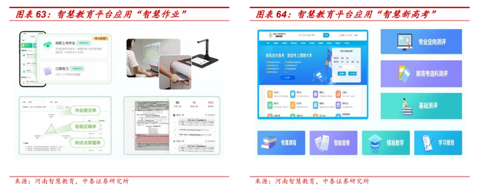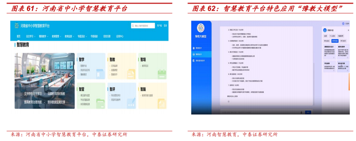 该平台推出特色应用“豫教大模型”,打造 AI 学习助手,为学生提供在线辅导、个性化学习资源推送等个性化服务,豫教精灵为教师提供教学建议、智能备课等服务,帮助优化学习体验,并提升教学效率与教学质量。另外,该平台亦包含支持智能批改功能的“智慧作业”及可提供生涯规划、志愿填报、教学提质增效服务的“智慧新高考”等多项应用。我们看好该平台的国有背书优势,并按照政策指引方向稳步推进省内学校推广落地。