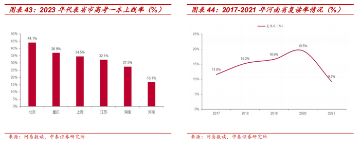 河南省教育资源较有限,复读人群有望提供教材教辅增量。河南省的教育资源相较于自身人口基数较为有限,教育竞争程度较激烈,同发达地区高考一本上线率差距明显,2023 年仅为 16.7%。因此,省内学生在发展上升通道较为单一的情况下,复读概率容易增加,复读率整体处于较高水平。该类复读人群对于教材教辅使用需求强,有望为公司教材教辅业绩提供增量。