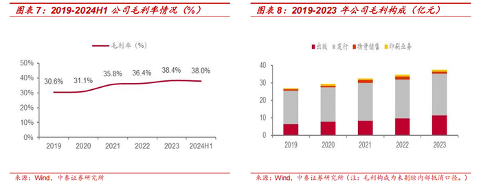 毛利率稳步向上,盈利能力持续向好。2019-2023 年,公司积极发挥完备产业链优势提升盈利能力,毛利率稳步向上,2023 年达 38.4%。其中,出版及发行为主要毛利来源,出版发行业务合计毛利由 2019 年的 25.5 亿元增至 2023 年的 35.2 亿元,毛利占比达 93.8%。