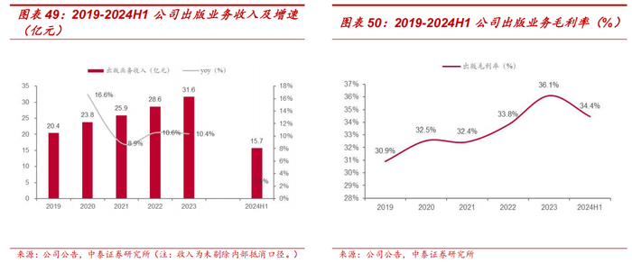 出版业务盈利能力向好,教育出版和大众出版区域领先。2019-2023 年,公司出版业务收入与毛利率稳中向好。教材教辅方面,公司继续成为河南省2024 秋—2027 春义务教育免费教科书“单一来源采购”供应商,采购预算金额 57.0 亿元,并打造全学科、全品类、全版本、全系列的教辅产品体系,保持区域领先地位。一般图书方面,公司聚焦特色出版,推出《自我突围》《山海经:中国神兽图鉴》等重点项目,为品牌价值提升和市场拓展奠定基础。