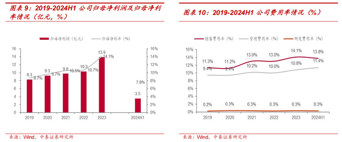 归母净利率整体稳中向好,费用支出稳定。公司归母净利润及归母净利率2019-2023 年整体稳中向好,2023 年分别达 13.9 亿元及 14.1%,2024H1有所下降主要因所得税优惠政策变化导致所得税费用增加。费用支出方面,公司销售费用率因销售费用中职工薪酬及广告宣传费支出增加略有提升;管理费用率则因管理费用中职工薪酬、折旧与摊销增加而有所上升;研发费用率保持稳定,费用支出整体较稳定。