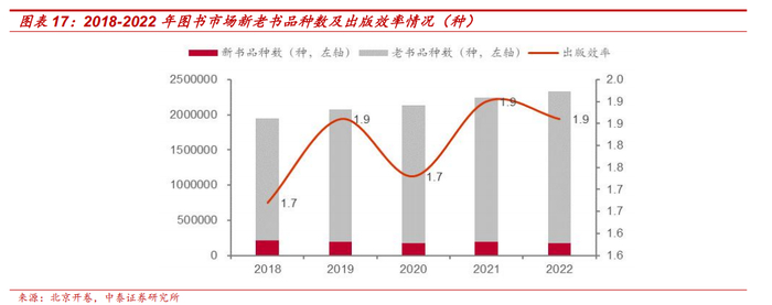 新书出版效率提升,利于打造内容良性发展业态。通过追踪读者阅读变化趋势,及时出版读者关注热点的图书能够有效触达读者,并基于此第一时间获取销售反馈进行优化,因此新书的出版效率提升明显。北京开卷数据显示,2022 年新书出版效率已达 1.9,反映出新书的单品种获益能力提升,能有效激发图书创作者的创作动力,促进新选题策划,从而持续产出高质量书籍,利于打造良性发展业态。