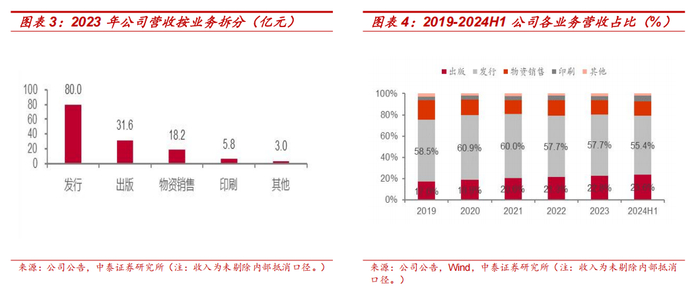 出版发行收入占比提升,收入结构持续优化。公司出版及发行业务为主要收入来源,公司在此基础上持续提质增效,压缩物资销售业务收入规模。2019-2023 年,出版发行两项业务收入占比均保持在 70%以上,2023 年收入占比达80.5%。