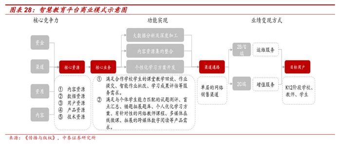 中小学智慧教育平台扎根校内场景,赋能出版行业业绩增长新动力。中小学智慧教育平台应用场景为校内,依赖于内容、教学数据等核心资源,通过对海量信息资源进行深度分析与集约整合,进而为用户量身定制个性化、交互式、多媒体个人学习整体解决方案类型的产品,实现“一个内容多种创意,一个创意多次开发,一次开发多种产品,一种产品多种形态,一次投入多次产出,一次产出多次增值”的效果。出版行业尤其是地方国企出版集团有望凭借资质、内容、渠道等优势布局智慧教育平台,并伴随其商业模式成熟挖掘业绩增长新动能。