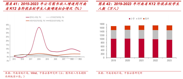 初高中学生人数同图书收入增长正向相关性明显,K12 学生结构调整有望支撑图书增长。我们尝试将公司图书(主要为教材教辅)收入增速趋势同河南省 K12 各阶段在校学生人数增速进行拟合,发现图书收入增速同初高中在校学生人数增速呈高度正相关,且明显强于小学及 K12 阶段。而在 K12 在校学生数中,省内初高中学生数占比已由 2019 年的 40.3%提升至 2023 年的 44.4%,我们预计未来初高中学生人数有望延续增长态势,看好 K12 学生结构调整有效支撑教材教辅产品持续增长。