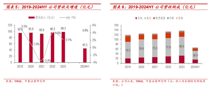 主业稳步推动收入稳中向上。2019-2023 年,公司因时而进,在推进创新业务探索的同时,聚焦主业,虽然 2021 年收入受疫情等因素影响有所承压,但整体营收仍然稳定,从 95.0 亿元增长至 98.3 亿元,4 年 CAGR 达 0.9%。其中,主业出版及发行业务(未剔除内部抵消口径)4 年 CAGR 分别达 11.6%及 3.3%,稳步推动公司收入向上。