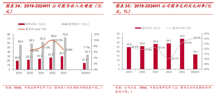 图书产品稳步向上,支撑公司收入与毛利向好。公司图书产品由教材教辅和一般图书构成,其中教材教辅为主要收入来源。教材教辅具有刚需特点,给予了公司业绩坚实支撑,2019-2023 年,公司图书产品收入(未剔除内部抵消口径)稳步向上,2023 年达 103.0 亿元,4 年 CAGR 达 7.7%,毛利率维持在 30-35%水平。