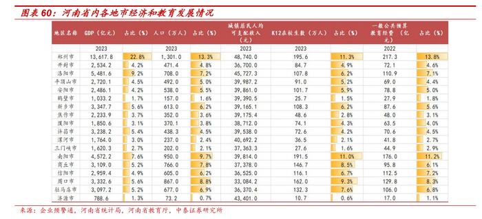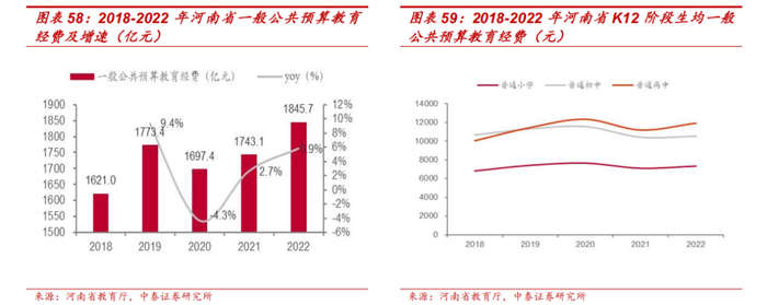 省内地市经济发展水平分化,教育资源不均衡现象明显。河南省内较注重教育经费投入,2018-2022 年教育经费整体保持稳定。但是,因资源禀赋、产业结构等因素影响,省内各地市经济发展水平仍呈现分化趋势,而教育资源不均衡现象也较为明显,部分地市同省会城市郑州在师资储备、教育水平等方面存在较大差距。