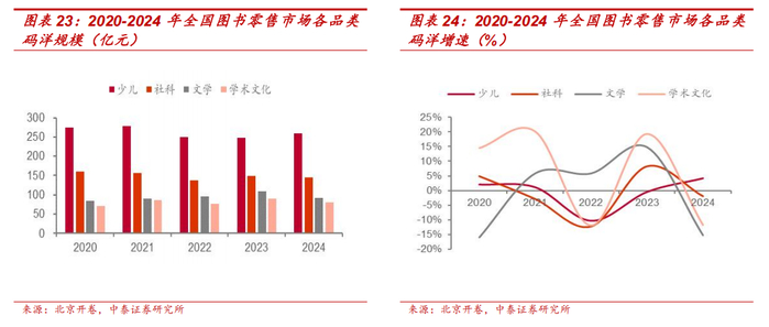 一般图书市场略承压,少儿图书展现韧性。一般图书具备可选消费属性,同宏观环境相关性较高。2024 年,图书零售市场在大众消费偏谨慎情况下,码洋规模(剔除教材教辅)达 868 亿元,同比下降 4.8%。一般图书各品类码洋增速有一定分化,少儿图书恢复正向增长展现韧性,而社科等品类则出现负向增长,后续伴随出版公司挖掘社交电商等流量洼地渠道以及优质内容推出有望驱动市场景气度回暖。