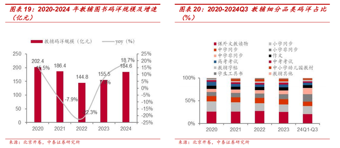 教材需求稳定,教辅表现亮眼有望延续稳增态势。国家广播电视总局、国家新闻出版署、北京开卷等数据显示,教材及教辅产品作为教学刚需品,长期保持较为稳定的市场需求。其中,教辅市场虽然 2021 年受双减政策影响有所承压,但业内玩家已逐步适应常态化监管节奏并进行转型。教辅图书在内容上更多聚焦提升学科素养、掌握有效的学习方法,该市场码洋规模2023-2024 年均实现正向增长,表现亮眼,后续有望伴随初高中学生人数增加及教育服务多元化延续稳定增长态势。