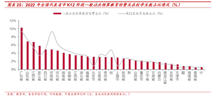 我国教育公平化需求亟待满足,智慧教育落地重要性愈发凸显。我国作为教育大国,虽然发展教育公平化已取得丰硕成果,但是仍面临诸多挑战。区域间的经济发展、社会文化、师资储备、教育成本差异,造成不同区域间教育资源及教育发展水平的不平衡,部分地区教育经费占比低于学生占比的现象仍然显著,例如河南省 2022 年 K12 在校学生数占全国代表省市学生数比重达 9.3%,教育经费占比仅 4.9%。
