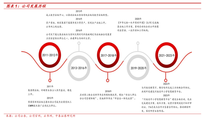 2011 年,公司借壳焦作鑫安上市。2013 年,公司成立数字出版中心,加快数字转型节奏。2014 年,公司完成资产重组,实现全产业链上市。2018 年,公司启动二轮新华书店体制改革,激发内生活力。2022-2023 年,公司聚焦智慧教育、课程研发、研学实践赛道,全面启动以服务现代教育为核心的智慧教育平台、课后延时服务智慧云平台和研学实践智慧平台建设。