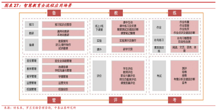 智慧教育应用场景有望持续拓展,实现教学全流程覆盖。现有智慧教育模式受制于场景复杂度、数字技术成熟度及适配性等因素,无法实现教学全流程应用覆盖,应用场景较为分散。我们认为,伴随 AI、VR/AR 等新兴技术成熟度增长,智慧教育应用场景有望持续拓展整合,实现“备课-教学-练习- 考试-评价-管理”的教学全流程覆盖,有效提升教师教学效率以及学生学习效率。