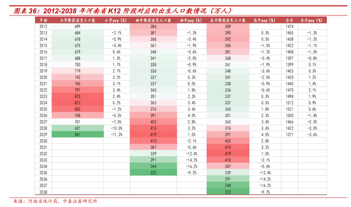 河南省人口基数优势明显,K12 在校学生规模中期内有望保持平稳。数量维度,根据河南省统计局数据,河南省 K12 阶段适龄就读人口数基数较大,近 10 年保持在 1,400-1,500 万人左右。按照出生人口正常的升学节奏推测,从 2026 年开始,河南省小学阶段适龄就读人口规模会出现一定程度下降,但初高中阶段仍将延续增长态势,K12 阶段在校学生规模中期内有望保持平稳。