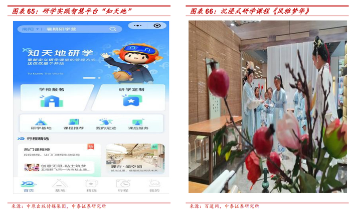 拓展研学布局,打造多元研学路线。素质教育方面,河南省内研学需求旺盛,但亦存在研学资源开发有限、产品良莠不齐、家长认知局限等挑战。公司凭借国有背书、内容、渠道等优势,拓展研学市场布局,致力成为集大成的优质内容资源建设者和知识服务提供方。一方面,公司成立河南创新实践教育公司,打造“研学实践智慧平台”,平台可提供多种研学产品以及研学效果评测等功能,有望实现研学实践的全周期管理,并同河南省中小学教育智慧平台关联。