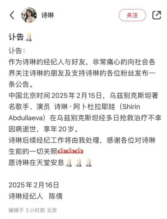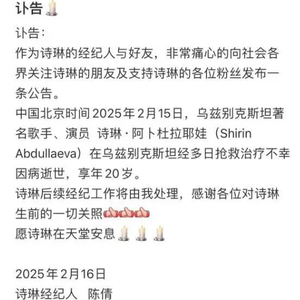 2月16日消息,有“中亚天籁”美誉的歌手诗琳去世,年仅20岁。2月16日7点39分,诗琳的经纪人通过诗琳的账号发布了讣告。