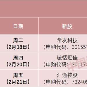 日程安排上,周二(2月18日)可申购创业板新股常友科技,周四(2月20日)可申购创业板新股毓恬冠佳,周五(2月21日)可申购沪市主板新股汇通控股。
