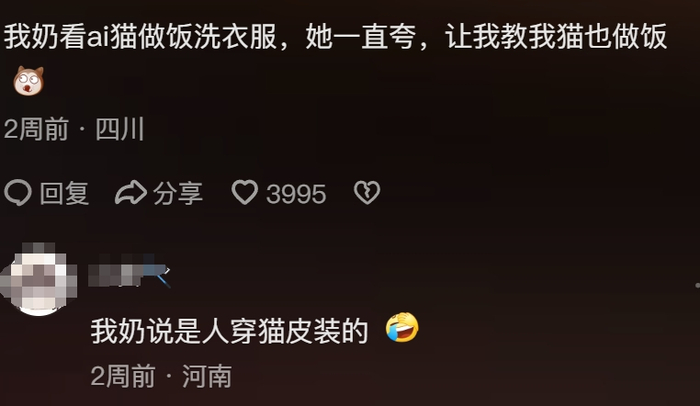 只不过00后们大多看着乐呵,却拦不住很多长辈是真的相信猫会做饭了。