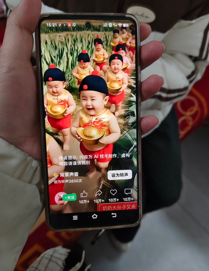 许多网友好奇点开了爷爷奶奶姥姥姥爷的短视频帐号,发现他们已经偷偷点赞了一大堆AI小孩的视频。