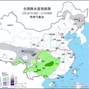 图1 全国降水量预报图(2月16日14时至17日08时)